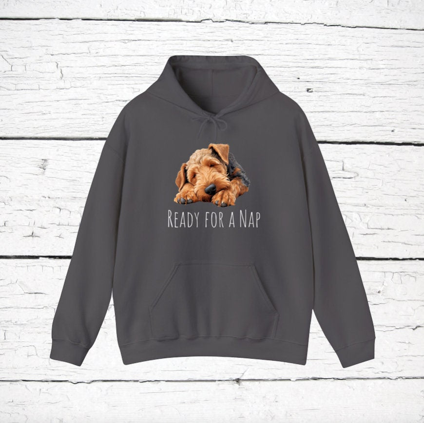 This Airedale Terrier "Ready for a Nap" hooded sweatshirt is perfect to snuggle into on a cool day.