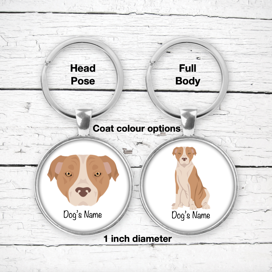 This American Staffordshire Terrier keychain is perfect for dog lovers. The bezel tray and key ring are both about 1 inch (25mm) across. The artwork is sublimated onto an aluminum insert.