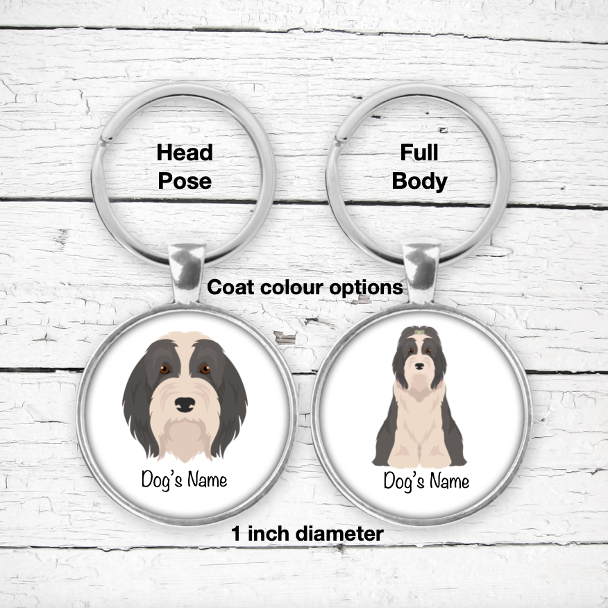 This Bearded Collie keychain is perfect for dog lovers. The bezel tray and key ring are both about 1 inch (25mm) across. The artwork is sublimated onto an aluminum insert.
