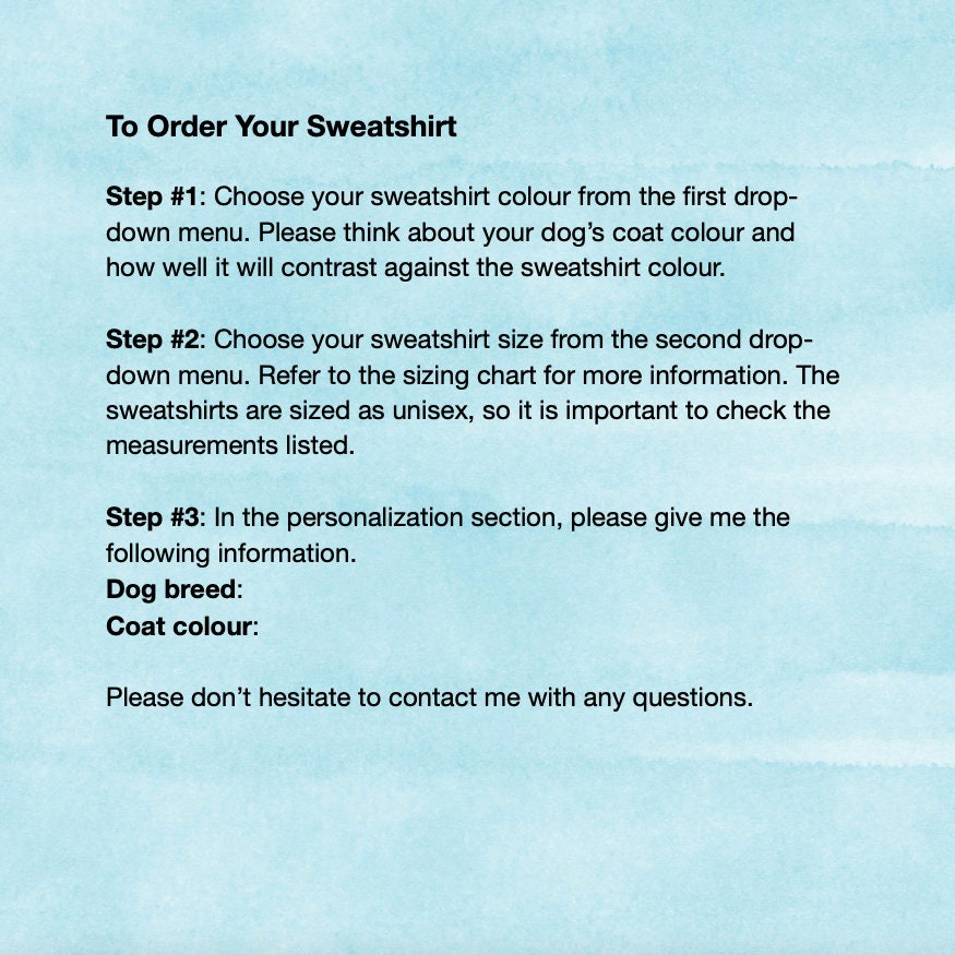 Step #1: Choose your sweatshirt colour from the first drop-down menu. Please think about your dog’s coat colour and how well it will contrast against the sweatshirt colour.
