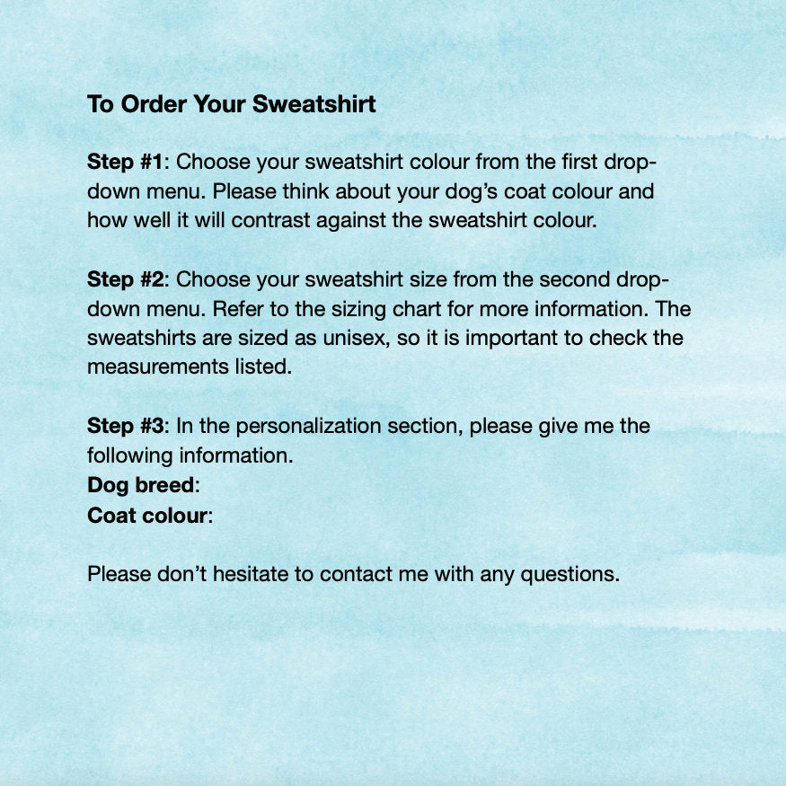 Step #1: Choose your sweatshirt colour from the first drop-down menu. Please think about your dog’s coat colour and how well it will contrast against the sweatshirt colour.
