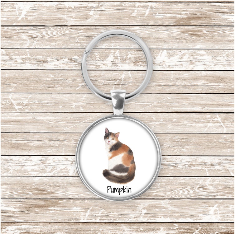 This calico cat keychain is perfect for cat lovers. The bezel tray is about 1 inch (25mm) across. The key ring is about 1.25 inches (32m). The artwork is sublimated onto an aluminum insert.