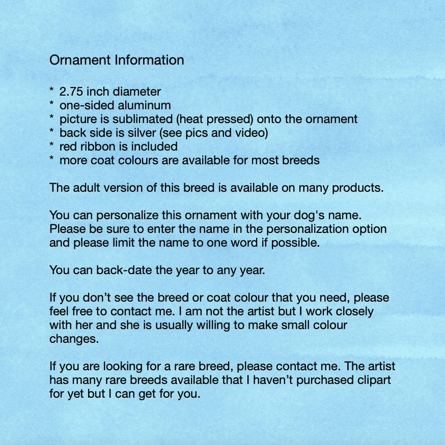 You can personalize this ornament with your dog's name. Please be sure to enter the name in the personalization option and limit the name to one word if possible.