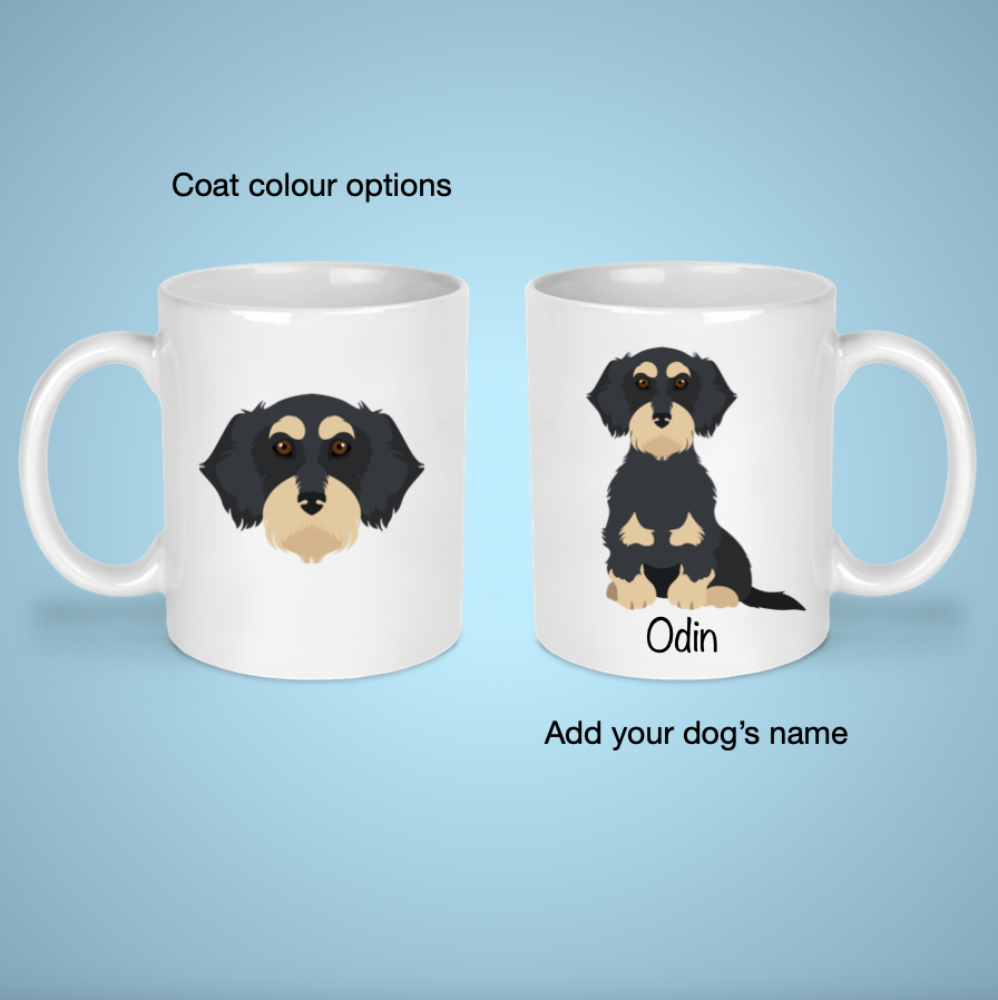 Please enter your dog's name for the front of the mug (facing you when held in right hand) in the Notes section in the cart.