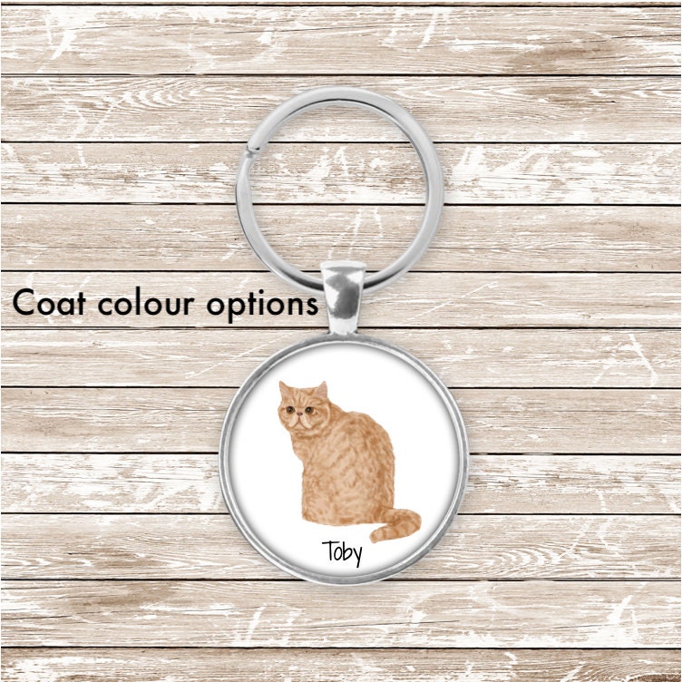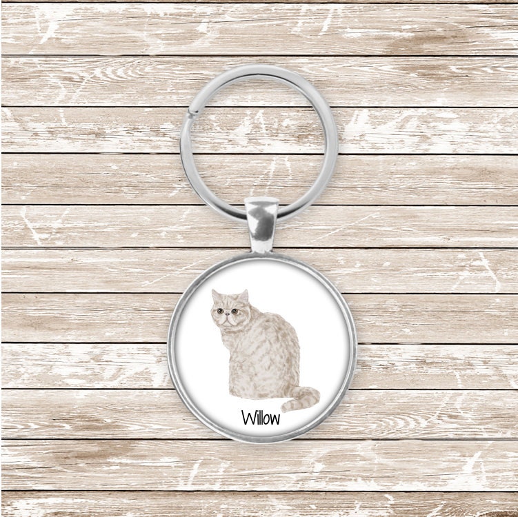 This Exotic Shorthair keychain is perfect for cat lovers. The bezel tray is about 1 inch (25mm) across. The key ring is about 1.25 inches (32m). The artwork is sublimated onto an aluminum insert.