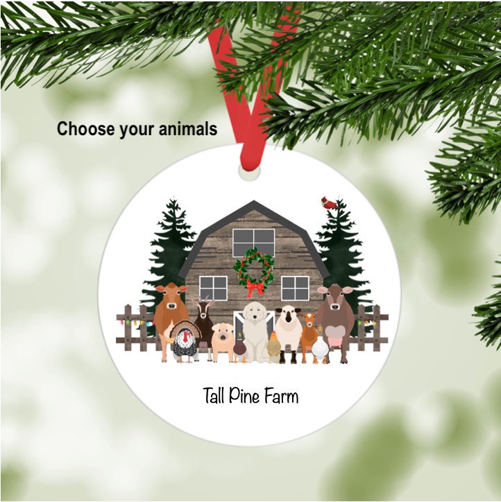 The animals have decorated their barn and they are ready for the big day. This ornament has a brown barn and there is snow. There are separate listings for other colour barns as well as without snow.