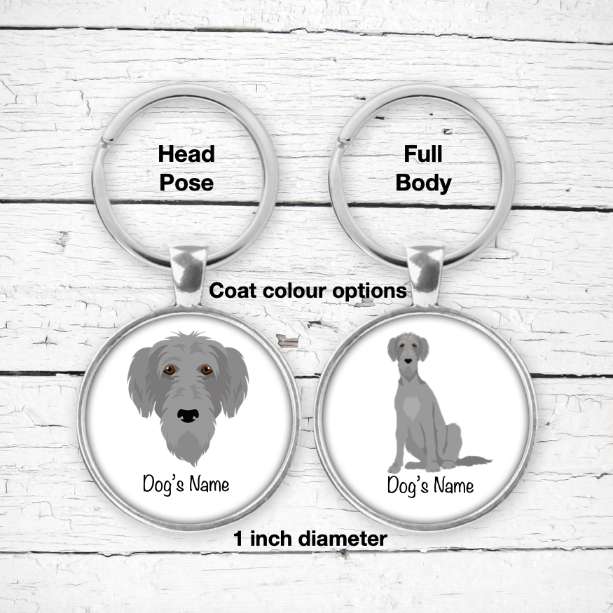 This Irish Wolfhound keychain is perfect for dog lovers. The bezel tray and key ring are both about 1 inch (25mm) across. The artwork is sublimated onto an aluminum insert.