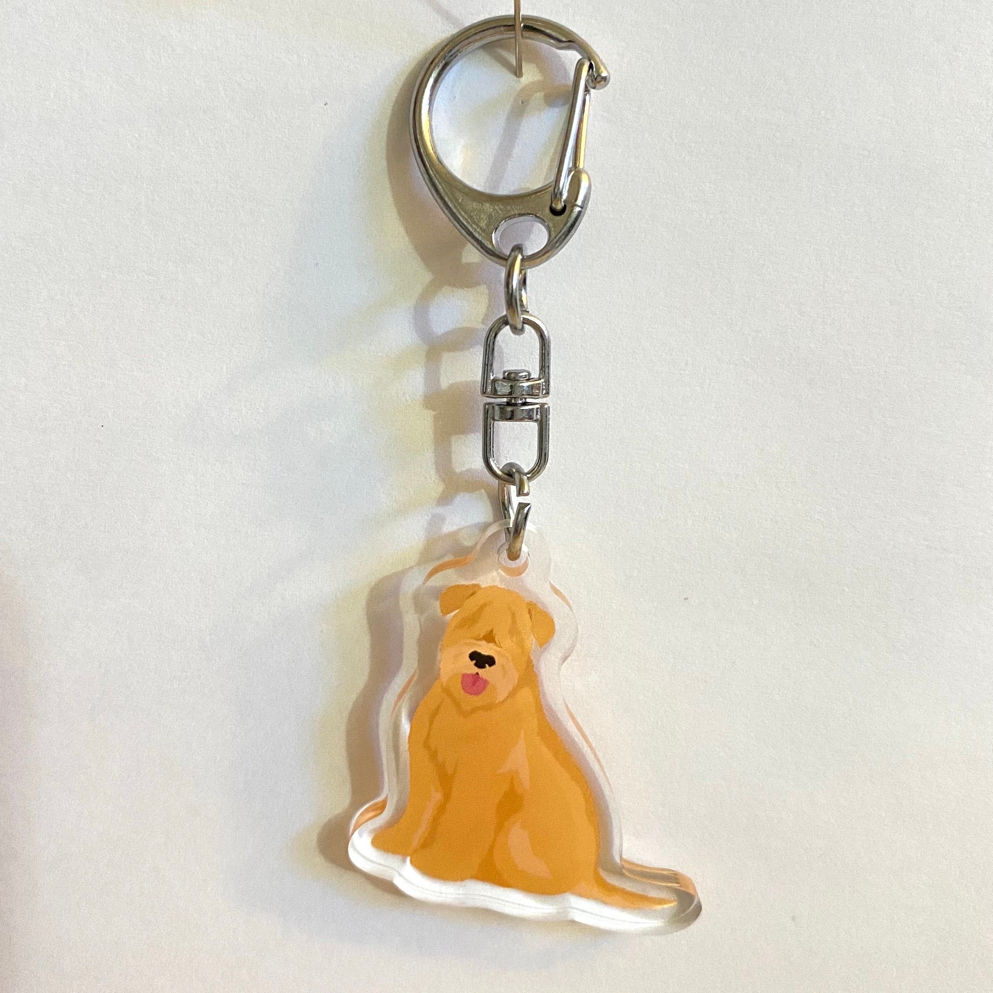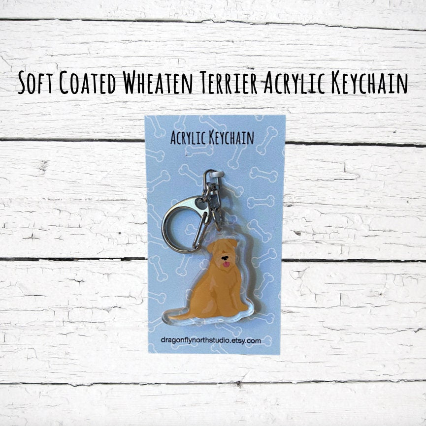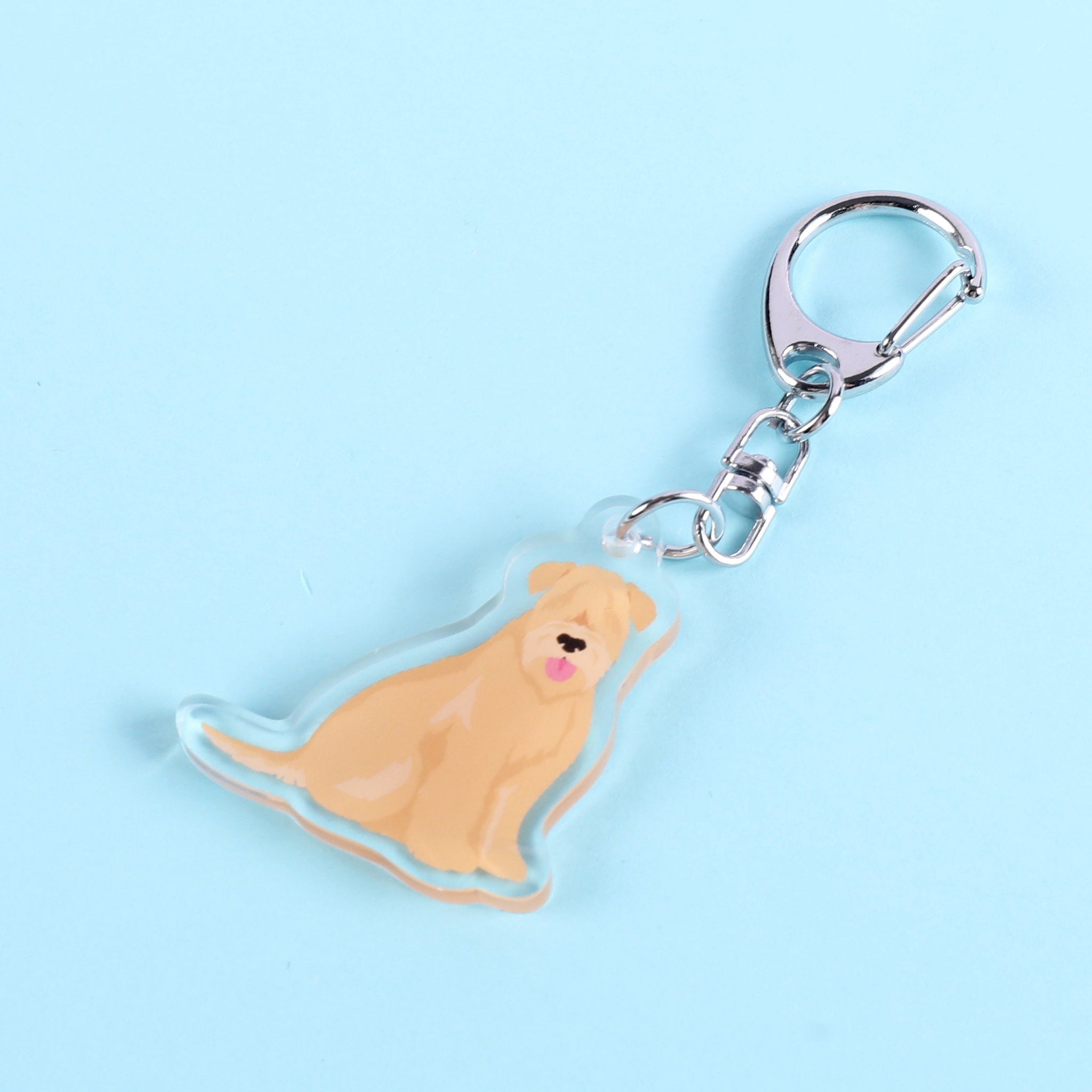 This Soft Coated Wheaten Terrier UV printed acrylic zipper pull can easily be fastened by the clasp, to be used for a zipper pull or keychain attachment.