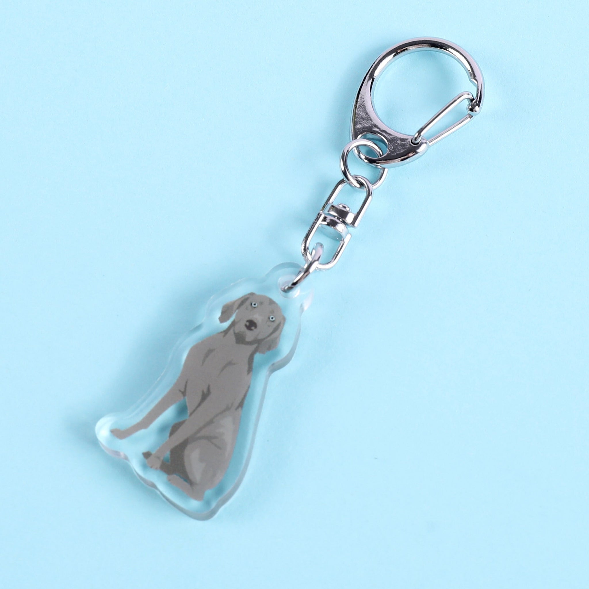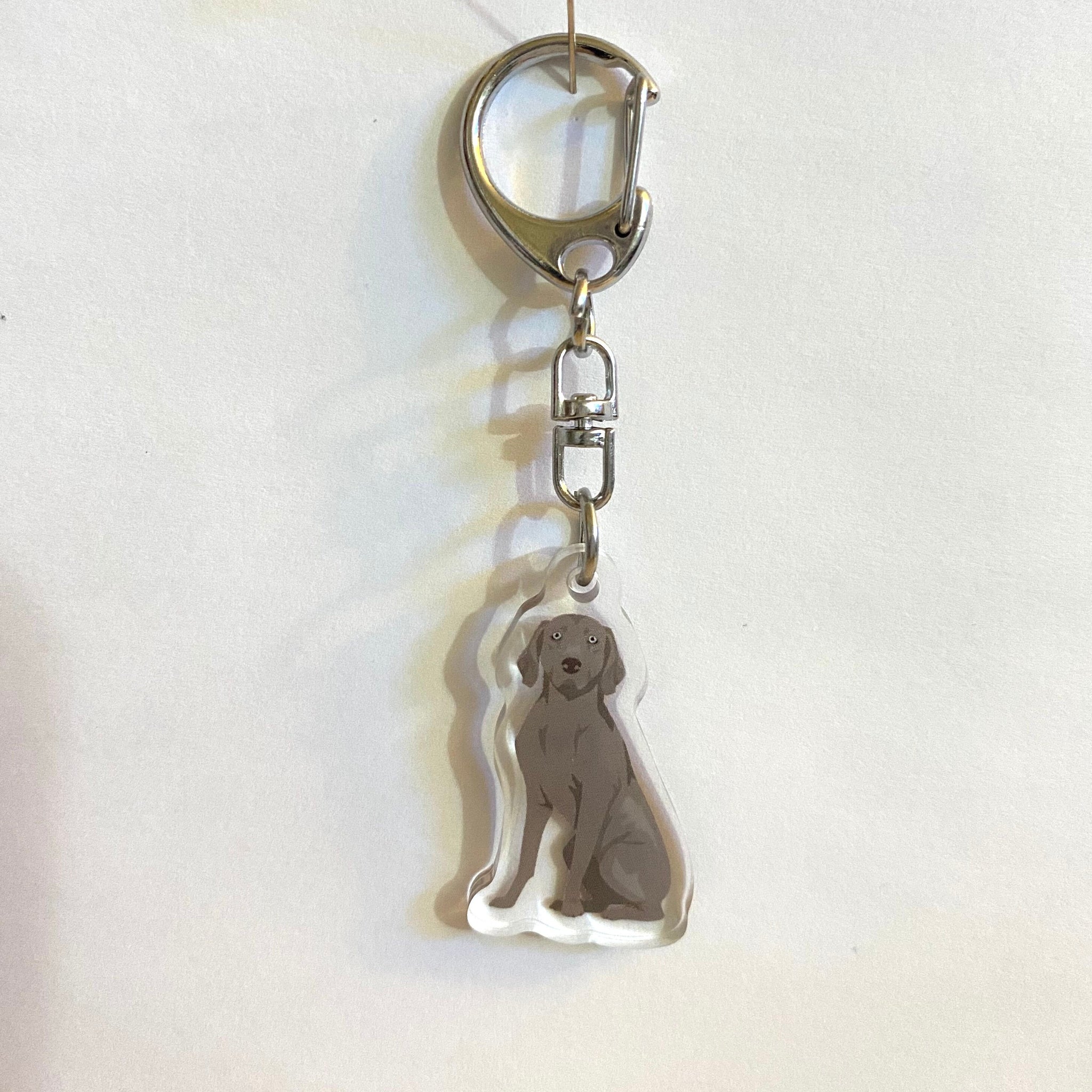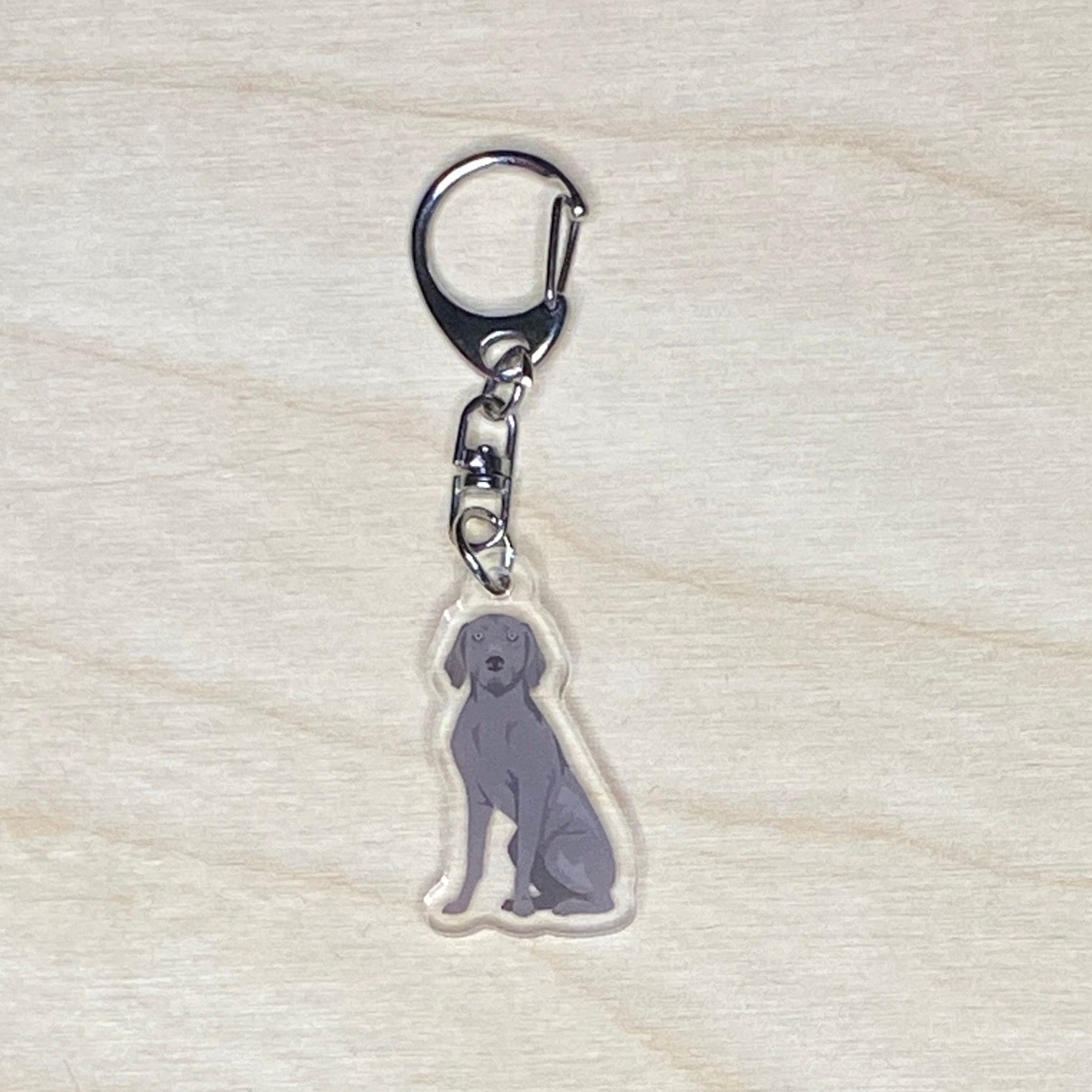 This Weimaraner UV printed acrylic zipper pull can easily be fastened by the clasp, to be used for a zipper pull or keychain attachment.